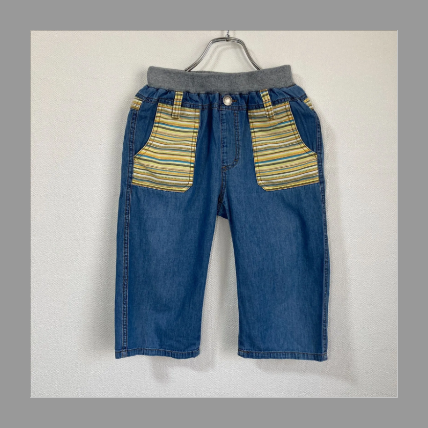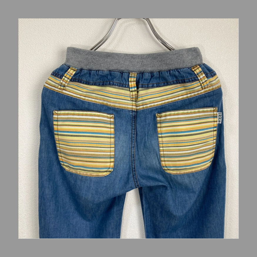 ポケットやベルトループに、カラフルなボーダー柄がアクセントになっている、