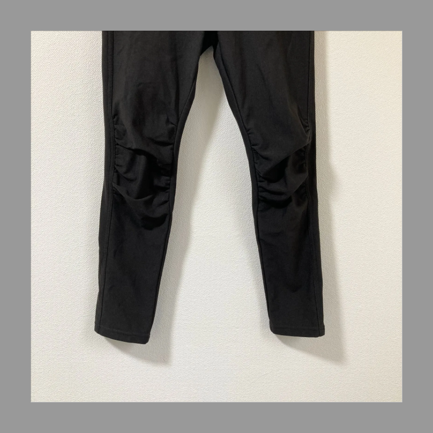細身のシルエットの、膝にギャザー仕様を施したレディースのシャーリングパンツです。