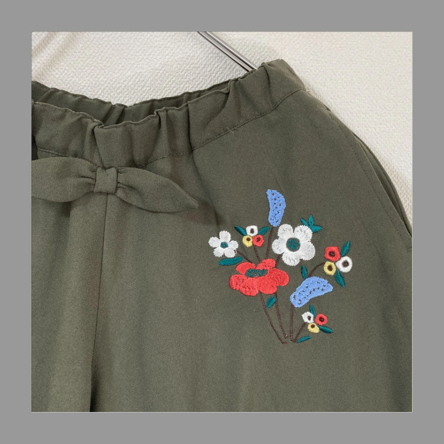 シルエットや、花やリボンなど、全体的に「かわいい」「ガーリー」な印象のショートパンツです。