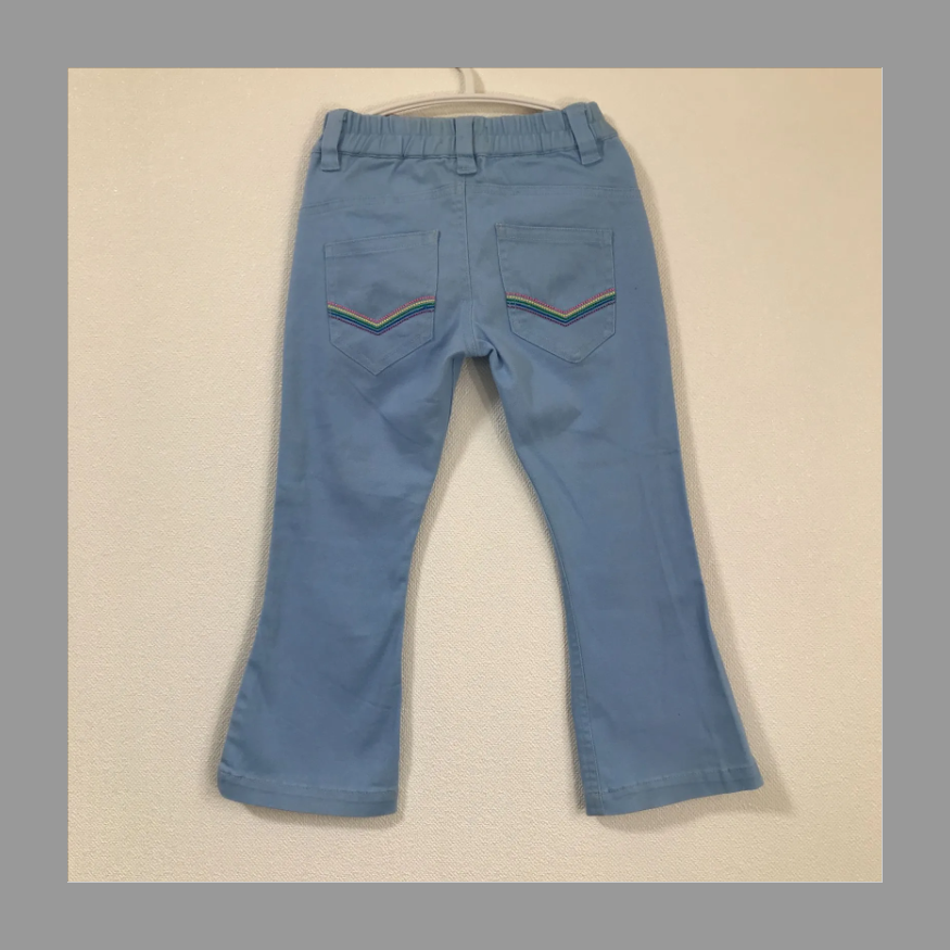 フロント左ふとももに、ハートのモチーフ、大小のバラと小さなハートがちりばめられた可愛いワンポイントロゴがあり、バックのポケットの虹色の刺繍もキュートなデザイン!!