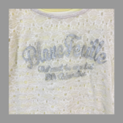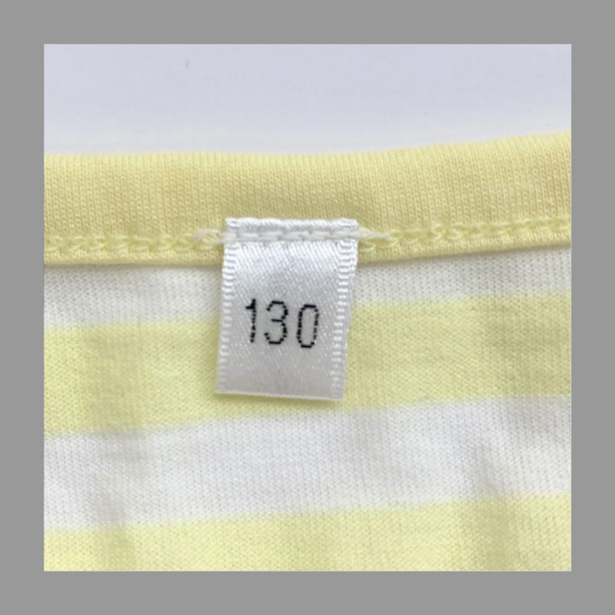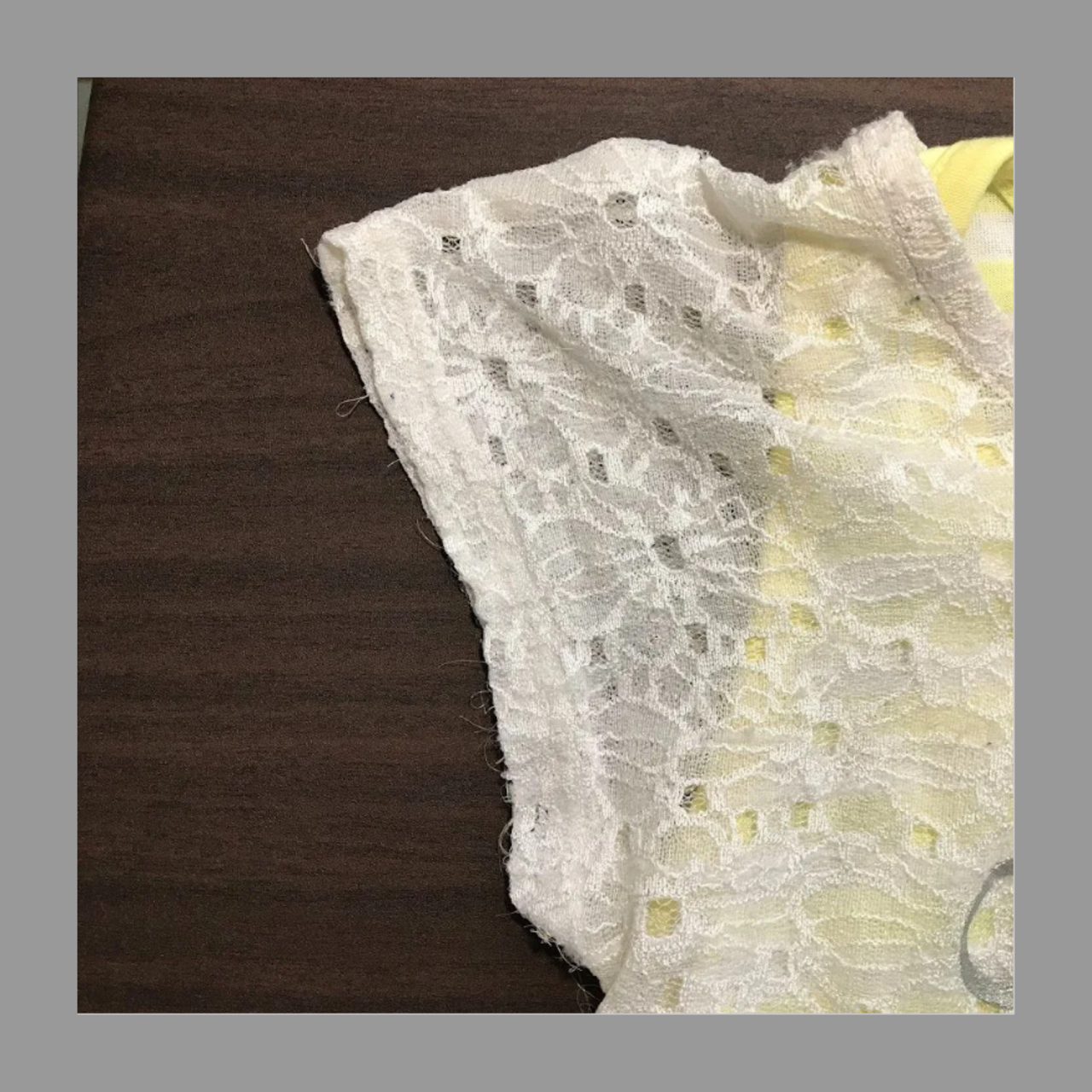 タンクトップ部分が黄色と白のボーダーで、白レースの花柄が肩のところで縫われていて、レイヤードされているチュニックで中央に筆記体で大小のロゴがあしらわれています。