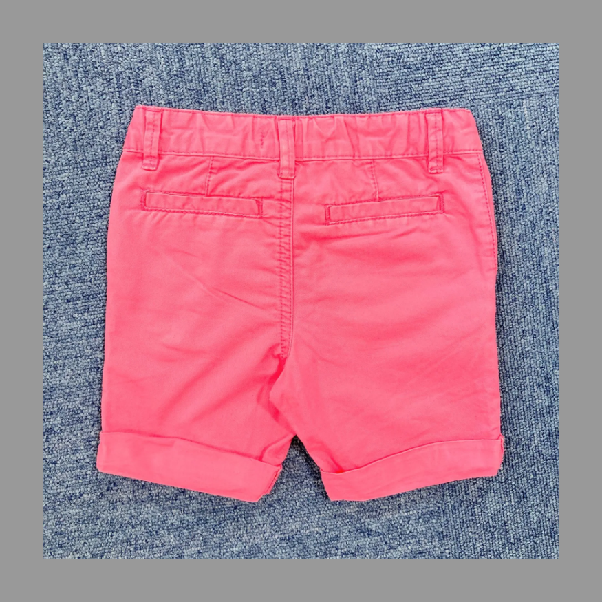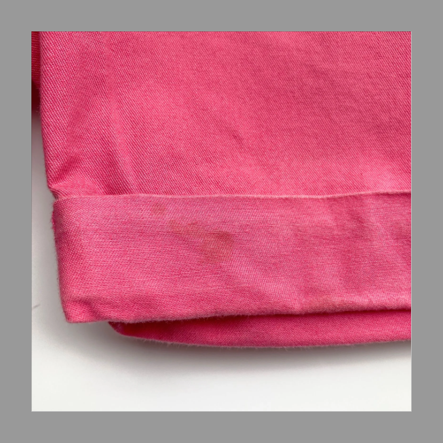 鮮やかなピンクのショートパンツで裾はダブル仕様。両サイドとおしりの計4つのポケットがあり、とても可愛い一品です。