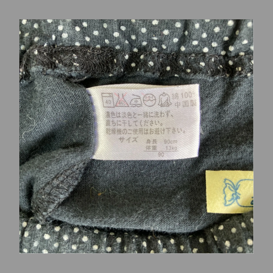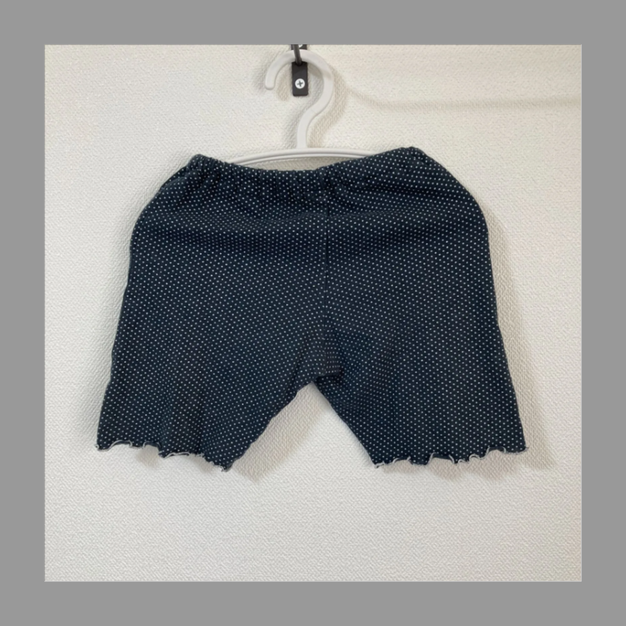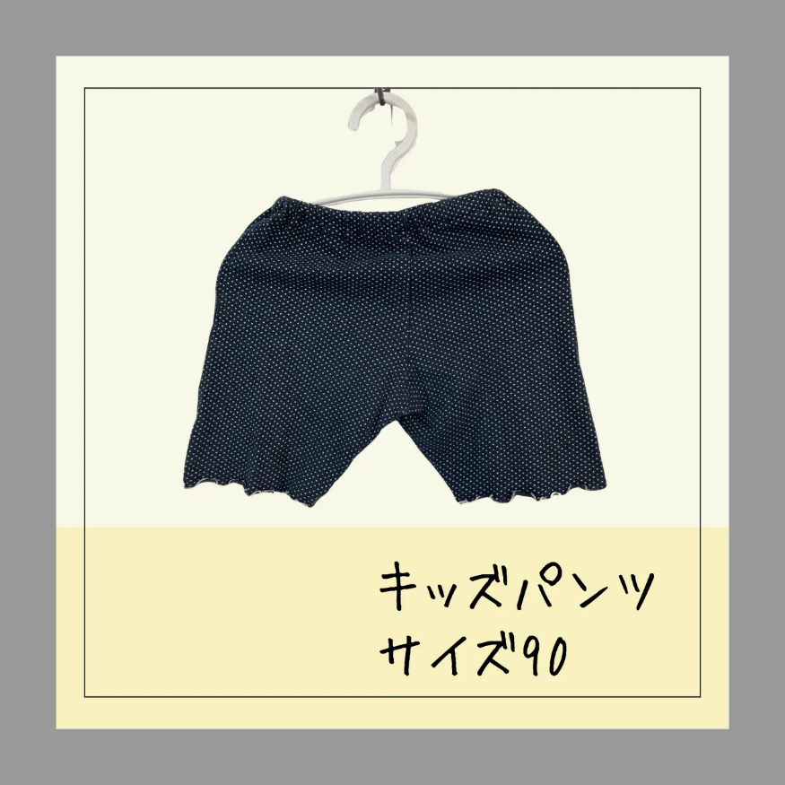 ウエストゴムで紺色ベースに、白の小さめのドット柄のパンツで、すそがギャザー加工されている可愛いパンツです!!