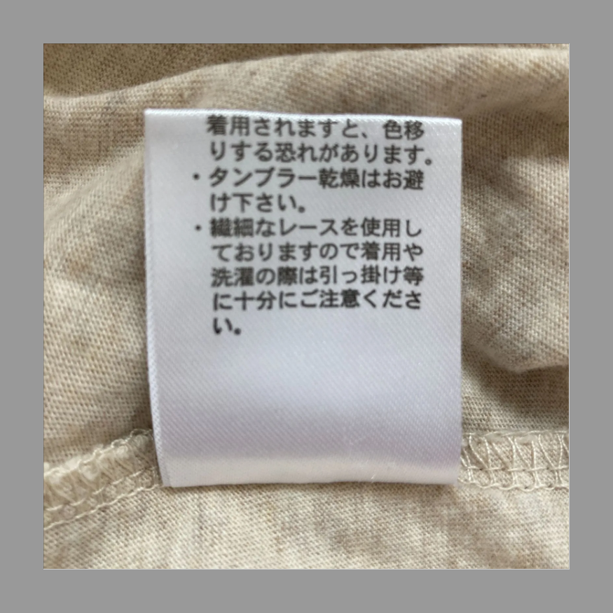 首元が広めの、ウエスト部の裾にレース生地があり落ち着いた雰囲気のある、ライトベージュカラー のレディースのロング丈のトップスです。