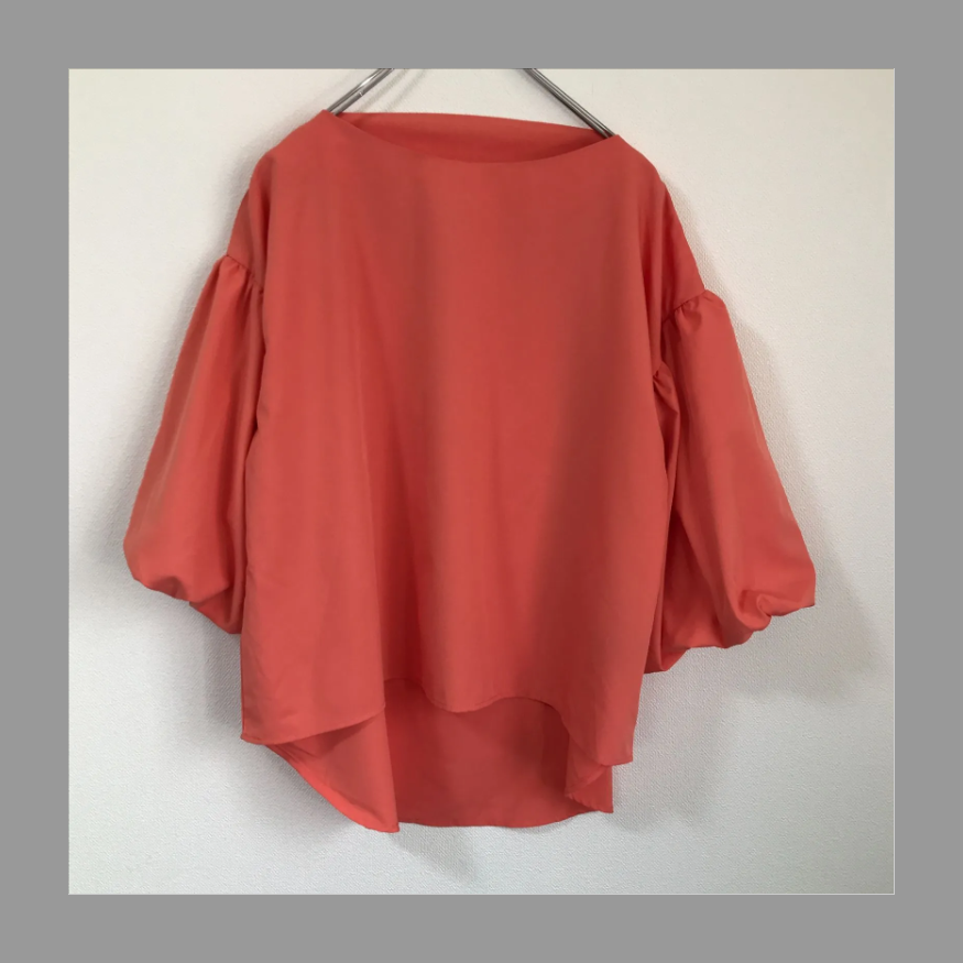 サーモンピンク系のピンクで、首がボートネック系、袖が五分丈のパフスリーブでガーリーな印象のトップスです(*´▽`*)♡☆彡