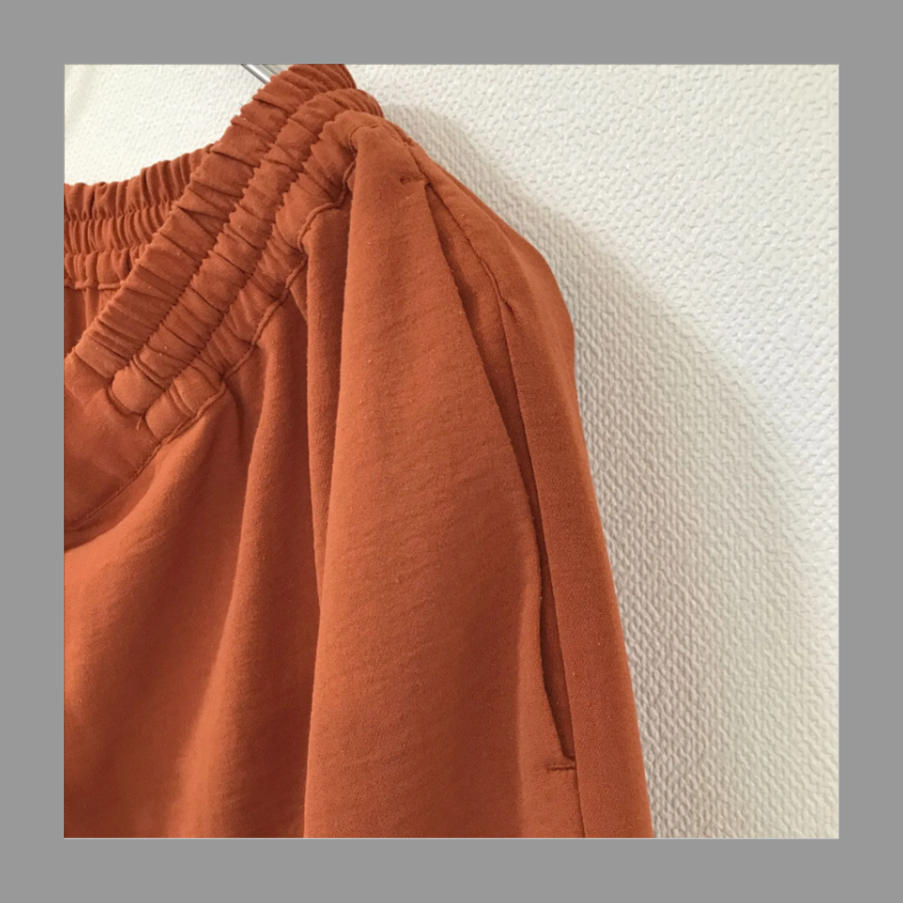 オレンジのワイドパンツ、ウエストゴムと紐で調節できるでパンツです(*´▽`*)♡