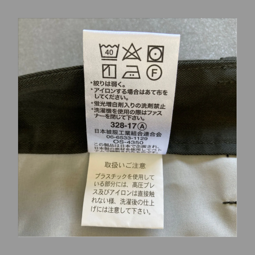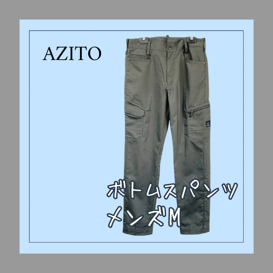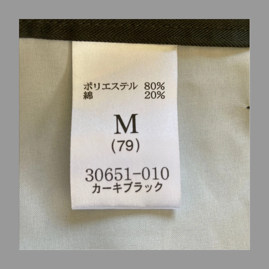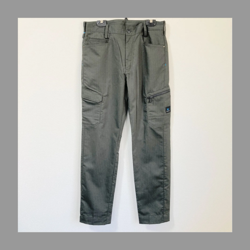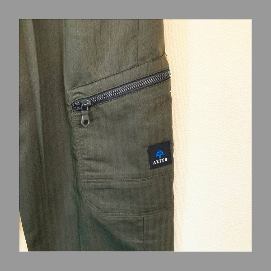 渋めのカーキ色でポリエステル多めのポケット6個ついた、作業系、ミリタリー風なパンツでカッコイイです(≧◇≦)!!