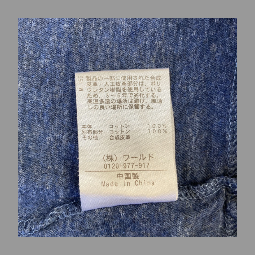 THE SHOP TKのスウェット生地のデニム調のブルーのTシャツで、肩や裾などの生地を繋ぎ合わせたような、個性的なポケTです(≧◇≦)!!