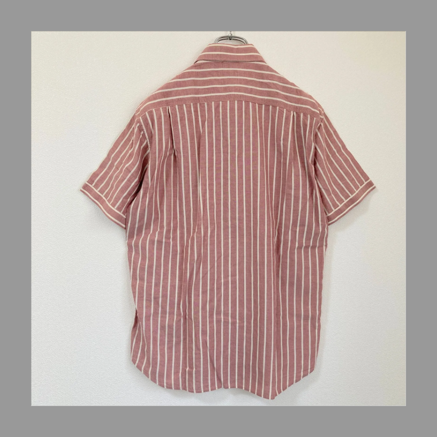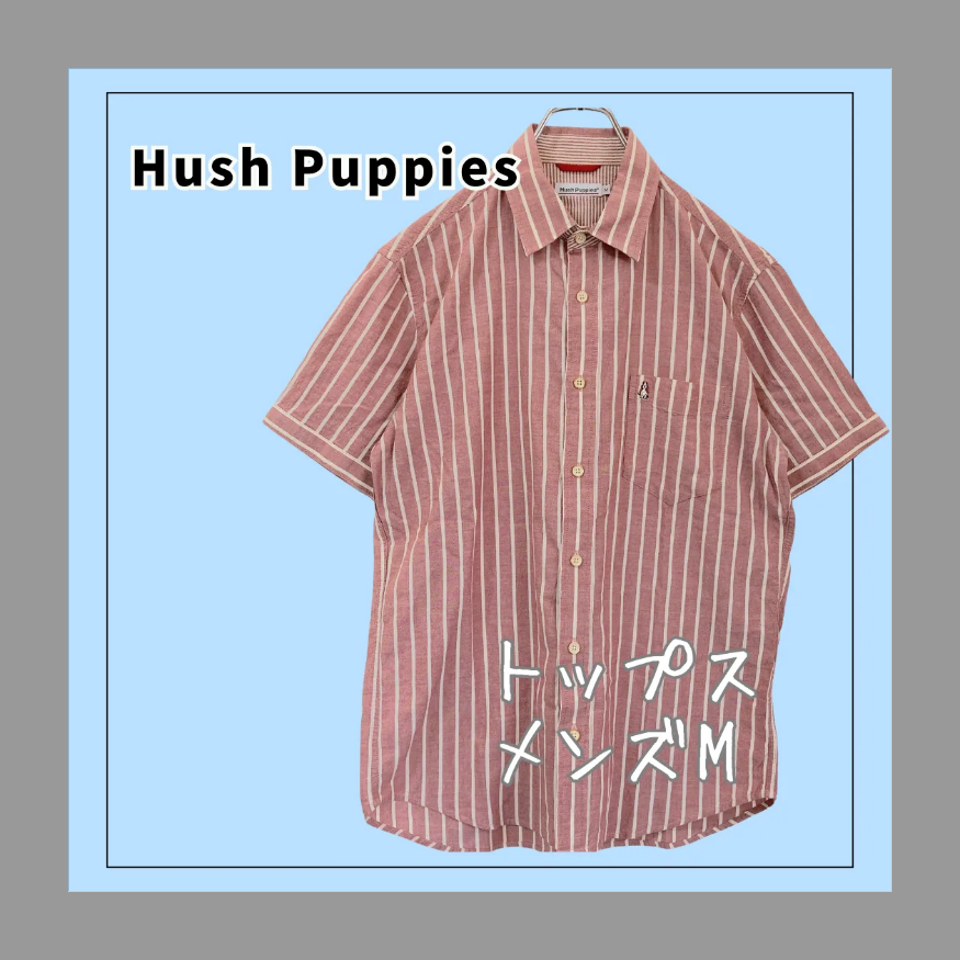 6765 ★ メンズ トップス シャツ 半袖 Hush Puppies M ストライプ柄 サーモンピンク オフホワイト USED 古着