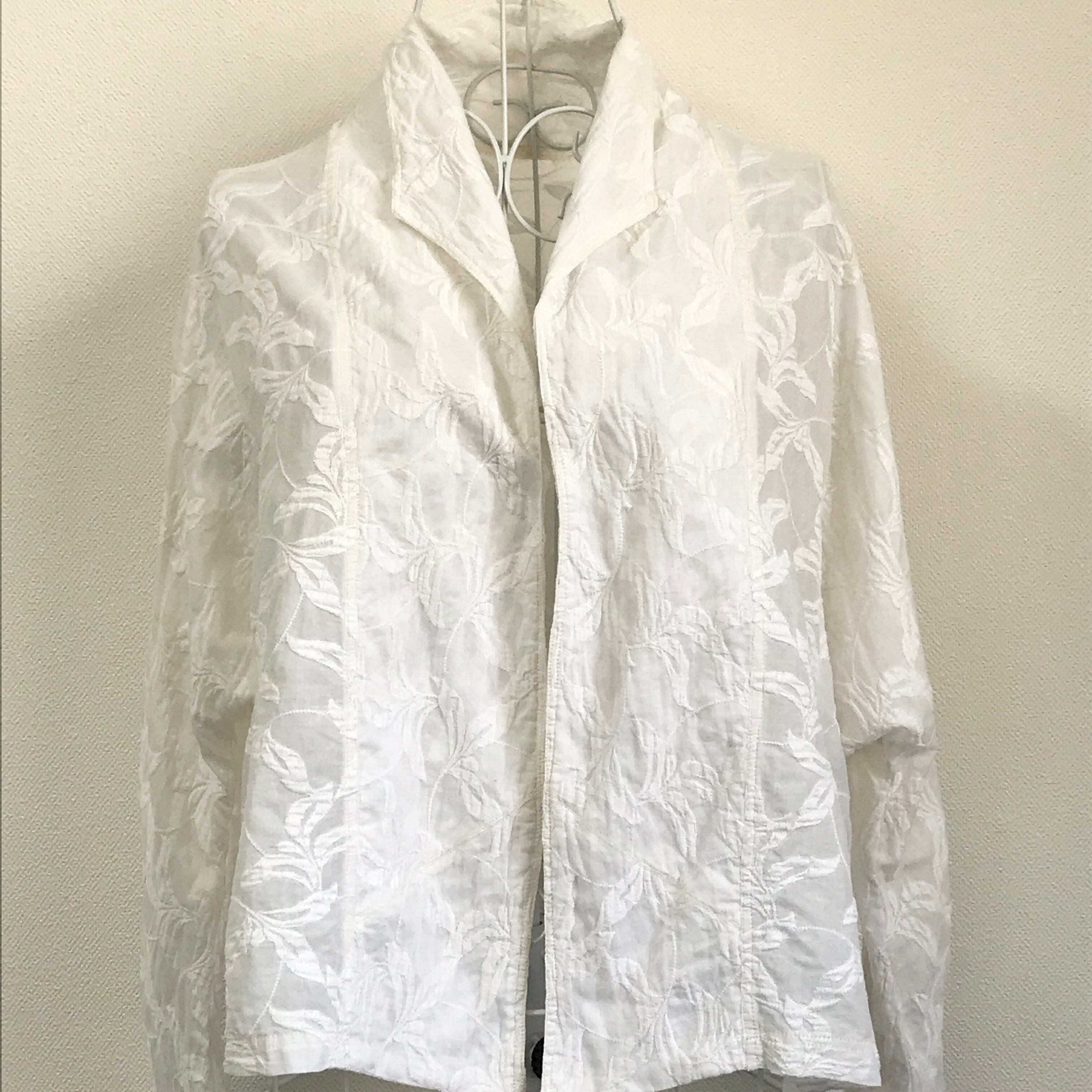白色のアウター、ボタンなし、草花柄・総刺繍柄の羽織物です。シンプルですが一枚羽織るだけで華やかな気分になれる一着です(*´▽`*)☆彡