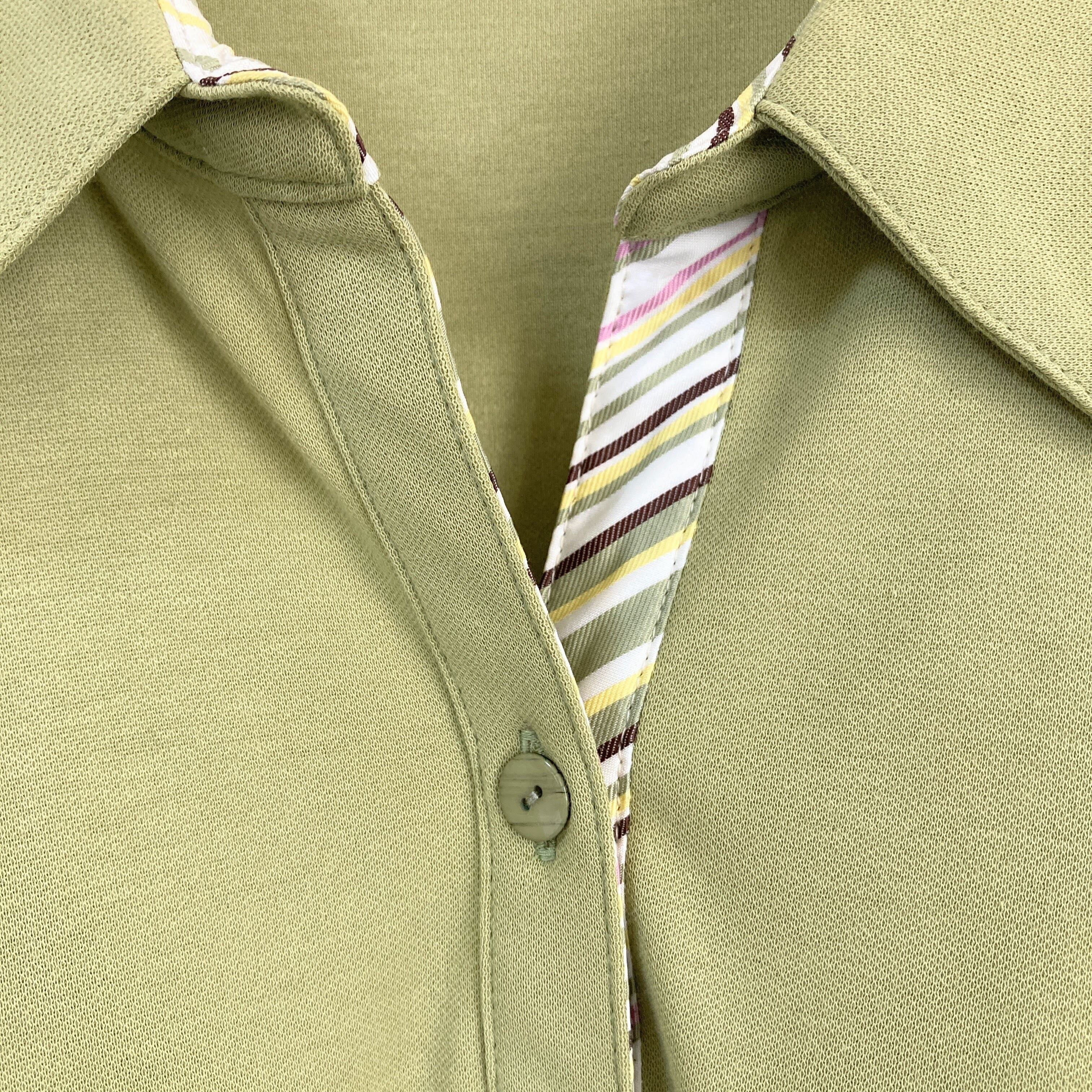 ピスタチオグリーン的な緑色でイイお色だと思います。首裏とボタン裏、袖うらに当て布でストライプのの生地が貼ってあり、アクセントになっており腕まくりして着ても爽やかでカッコイイ一着だと思いいます(*´▽`*)♡