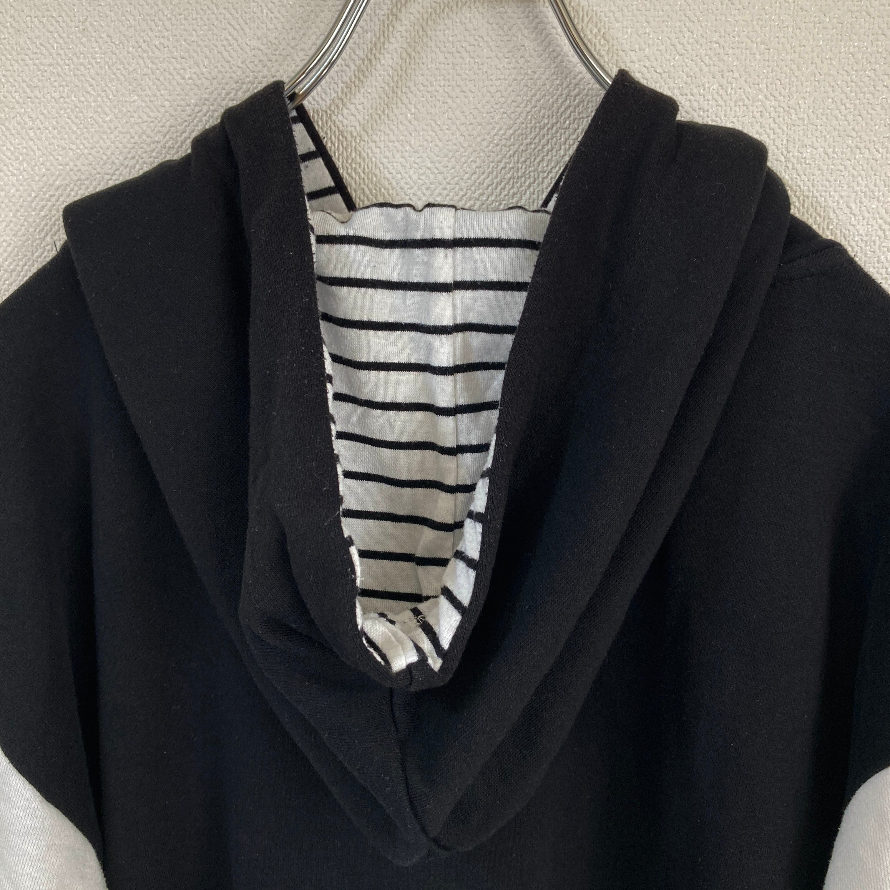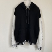 両腕にロゴの入った黒と白を基調としたパーカーで、フードの内側がボーダーになっている、カジュアルなパーカーです(*^^)v