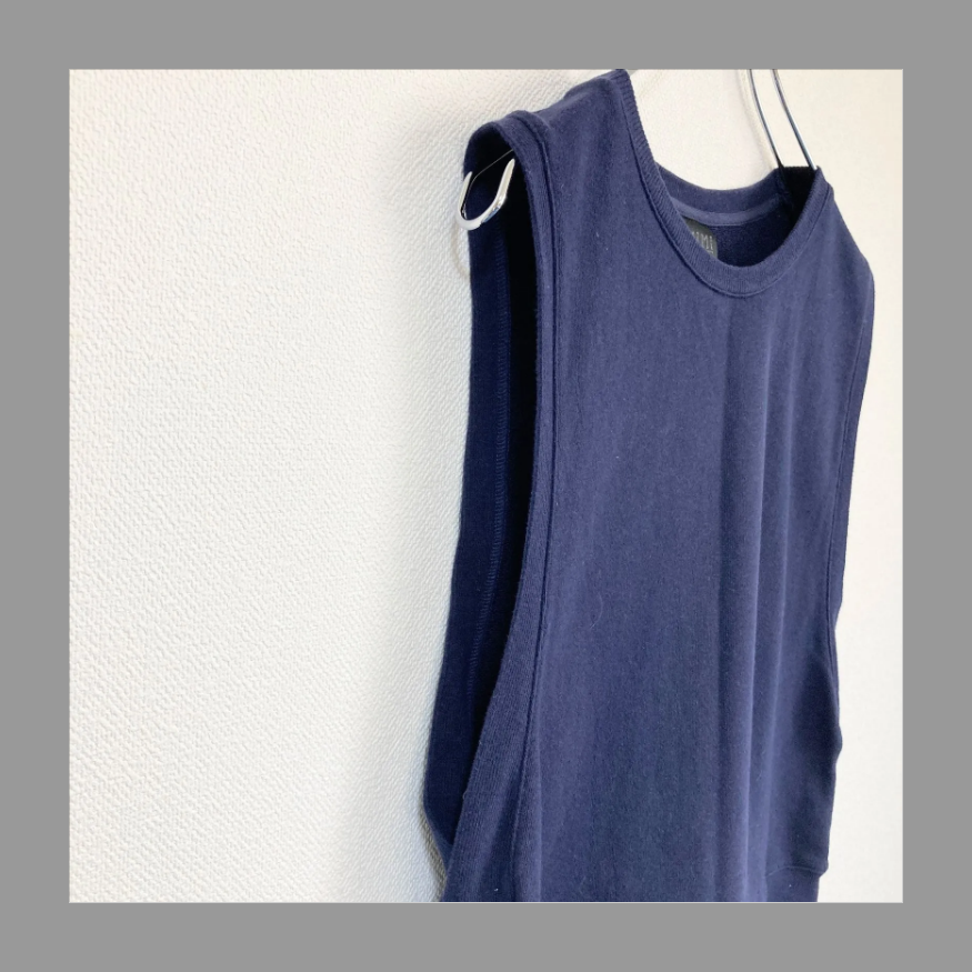 品のあるヴィンテージ感のある無地のネイビーカラーと、脇の部分が広めに開いているので、重ね着コーデのアクセントや、シャツなどに合わせると落ち着いた雰囲気を演出します。