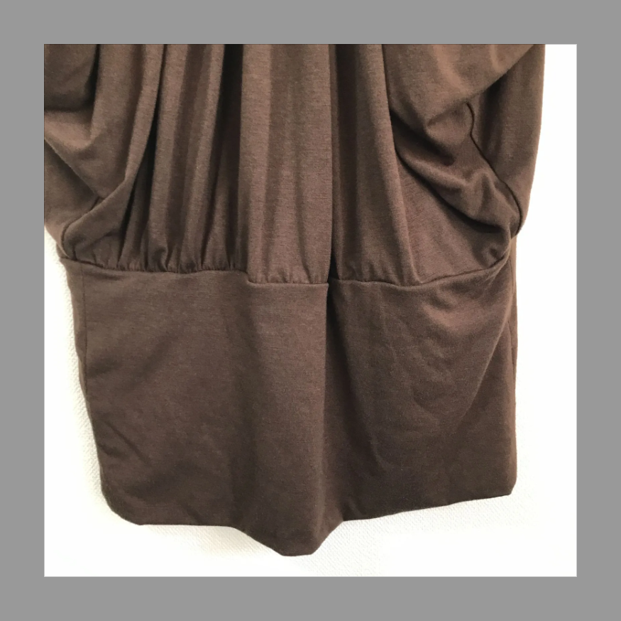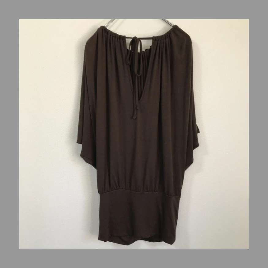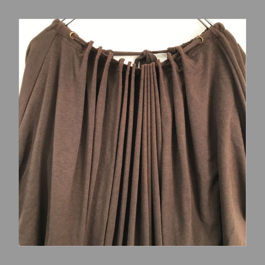 フリーサイズのカットソー。ドルマン袖、前はプリーツ状で、後ろは結んで首周りのサイズを調整するようになっている個性的な一着です(*´▽`*)♡