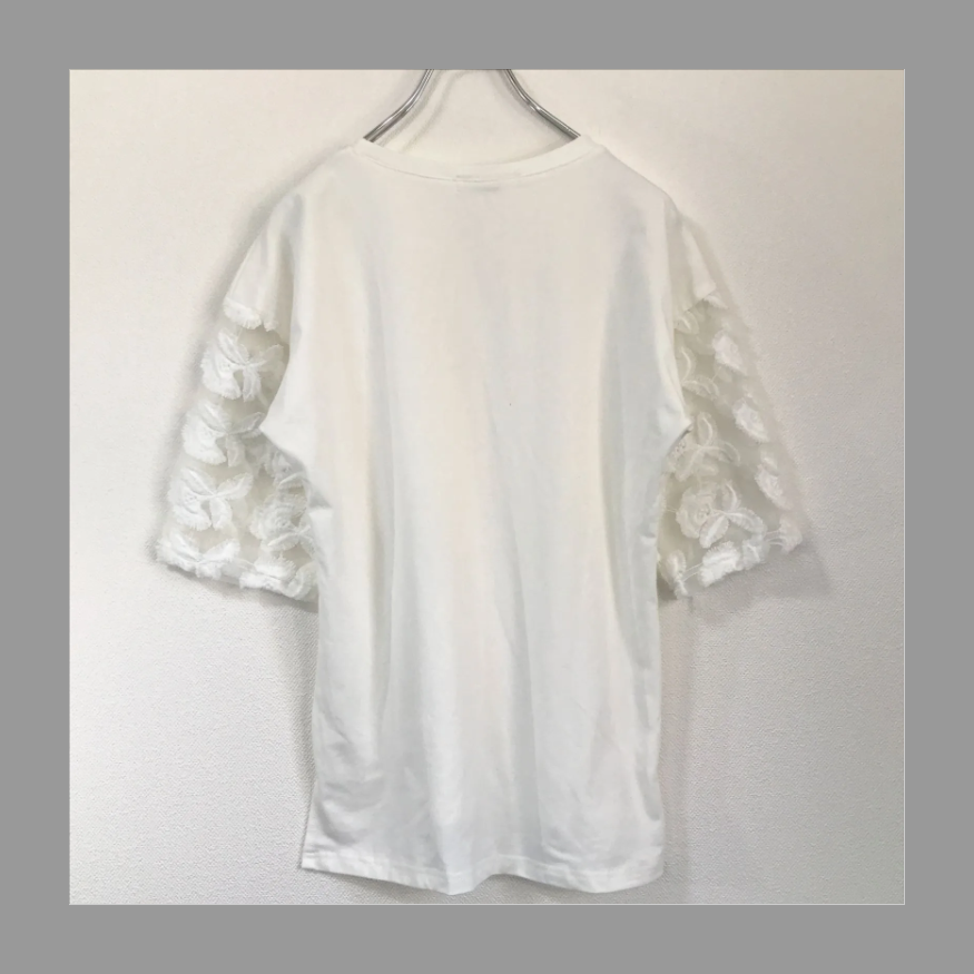 レースのようなさり気ない花柄の袖が華やかな印象にしてくれるトップス。