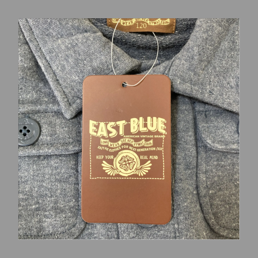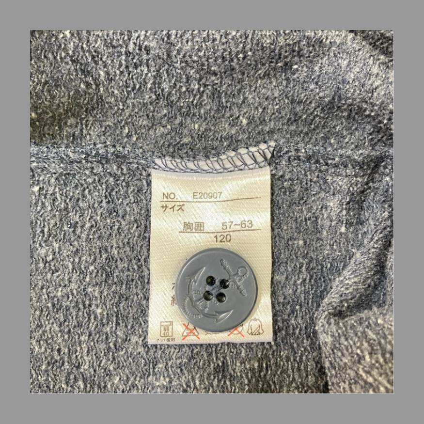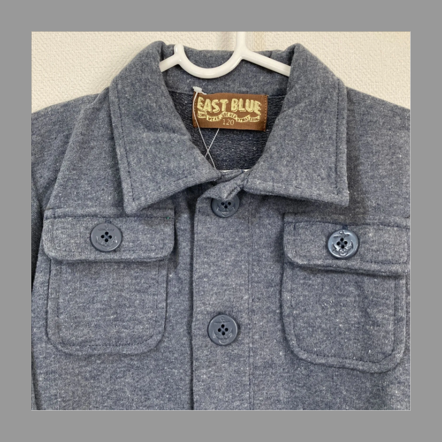 薄めのブルーに、よく見たら霜降りで白い模様が入った、襟つきのフリース、スウェット系のライトアウター的な一着。カワイイ胸ポケットが二つついたジャケットです(*´▽`*)!!