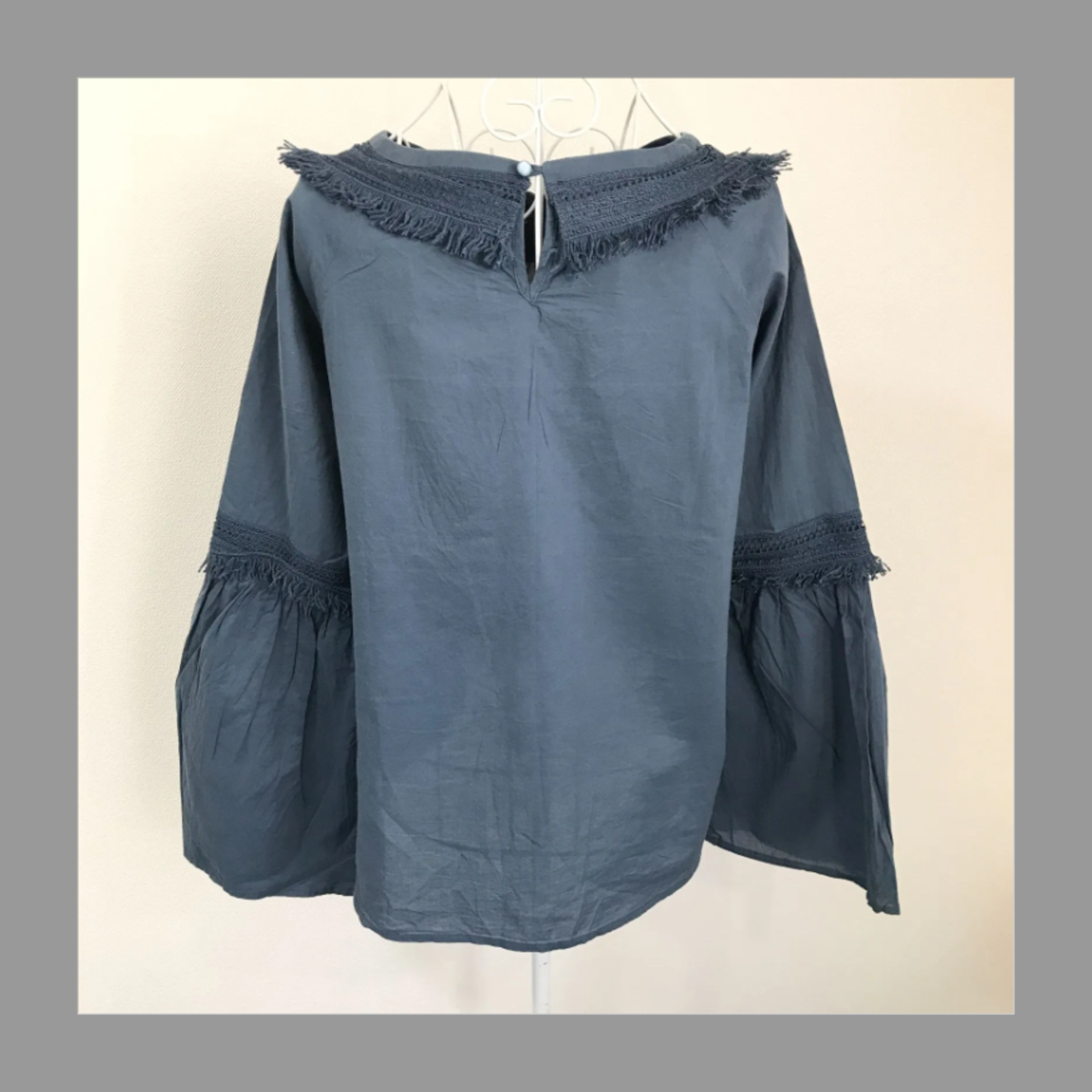 Vネックで首と袖にフリンジが大胆に配置された綺麗なシャツブラウスです(^_-)-☆