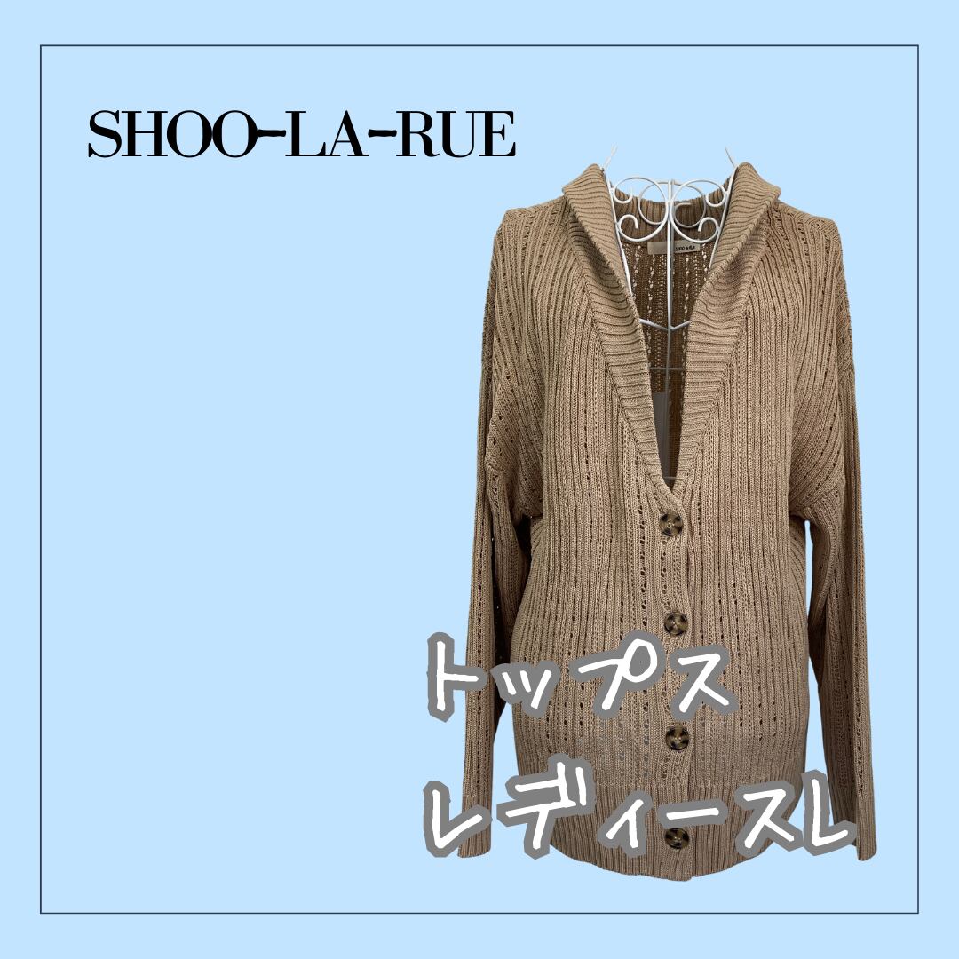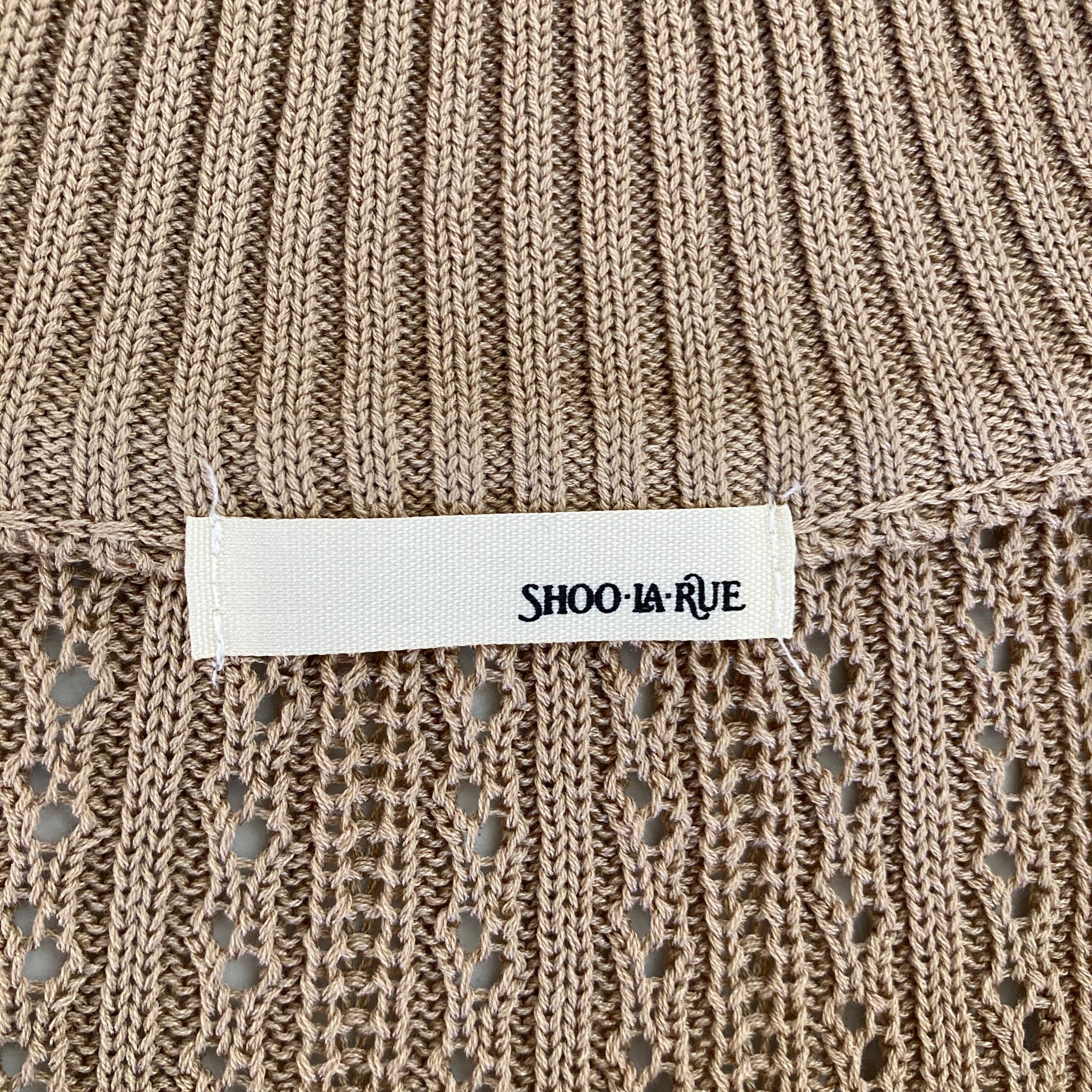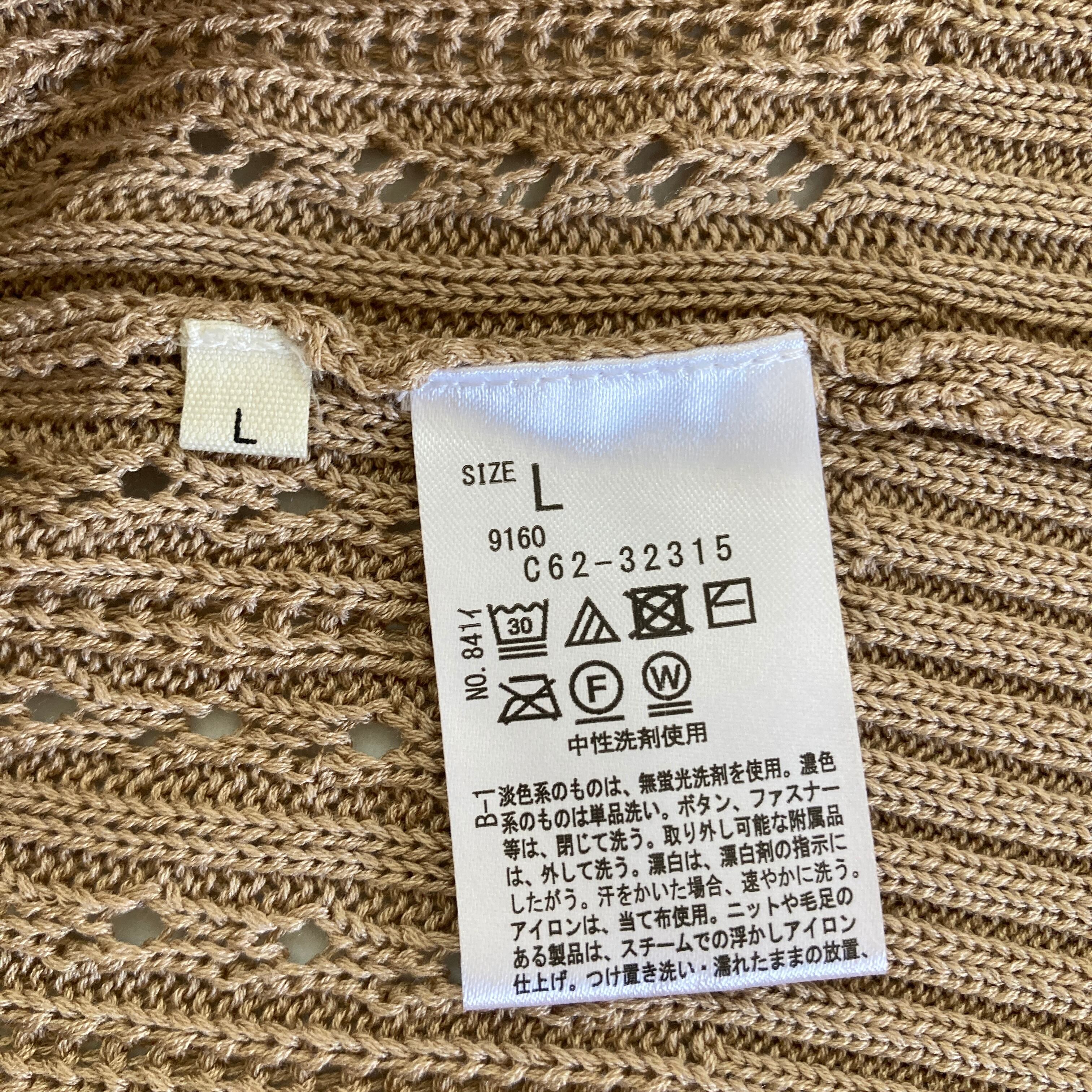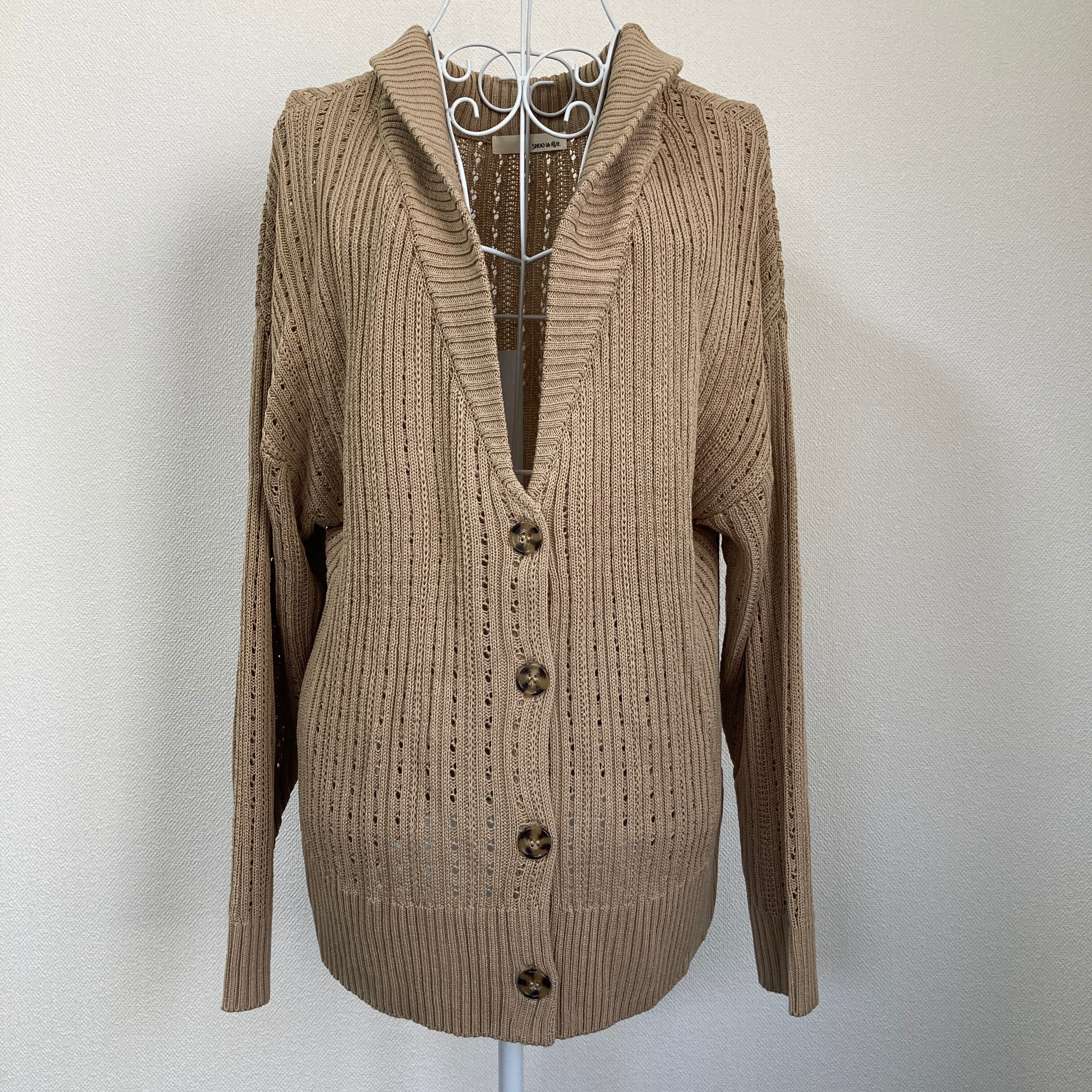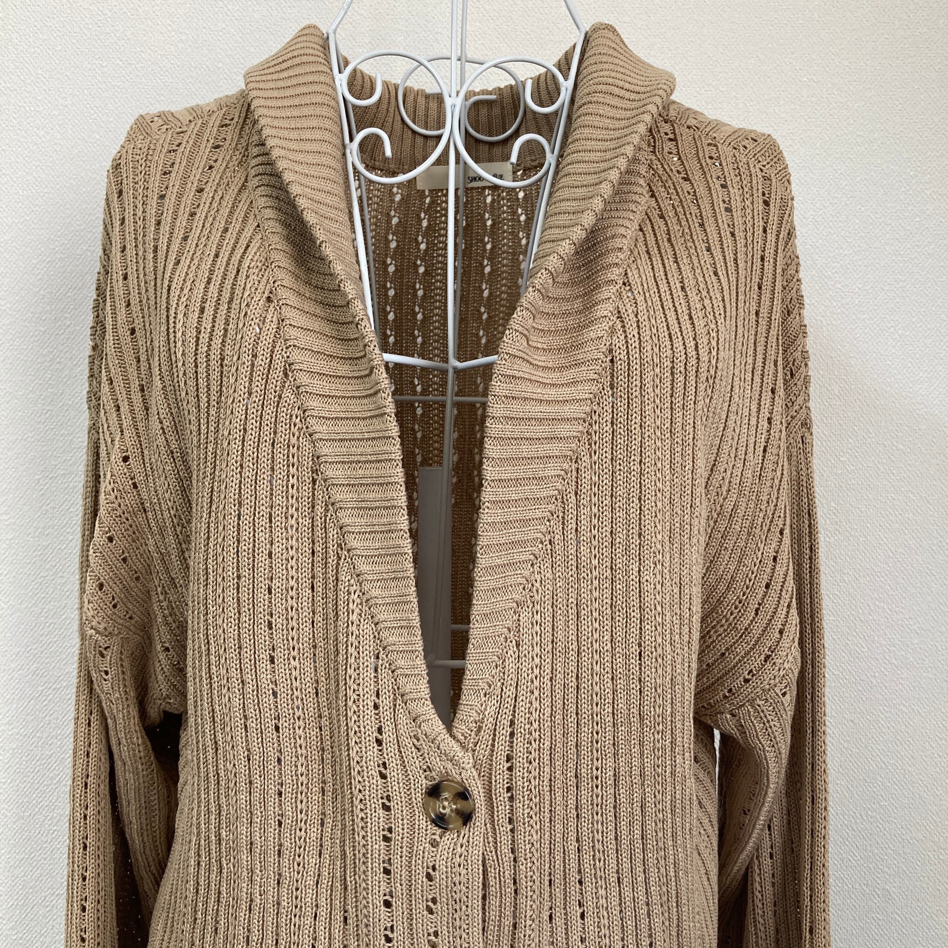 前が大きく開いた茶色のカーディガンで、大きめの作りになっています。