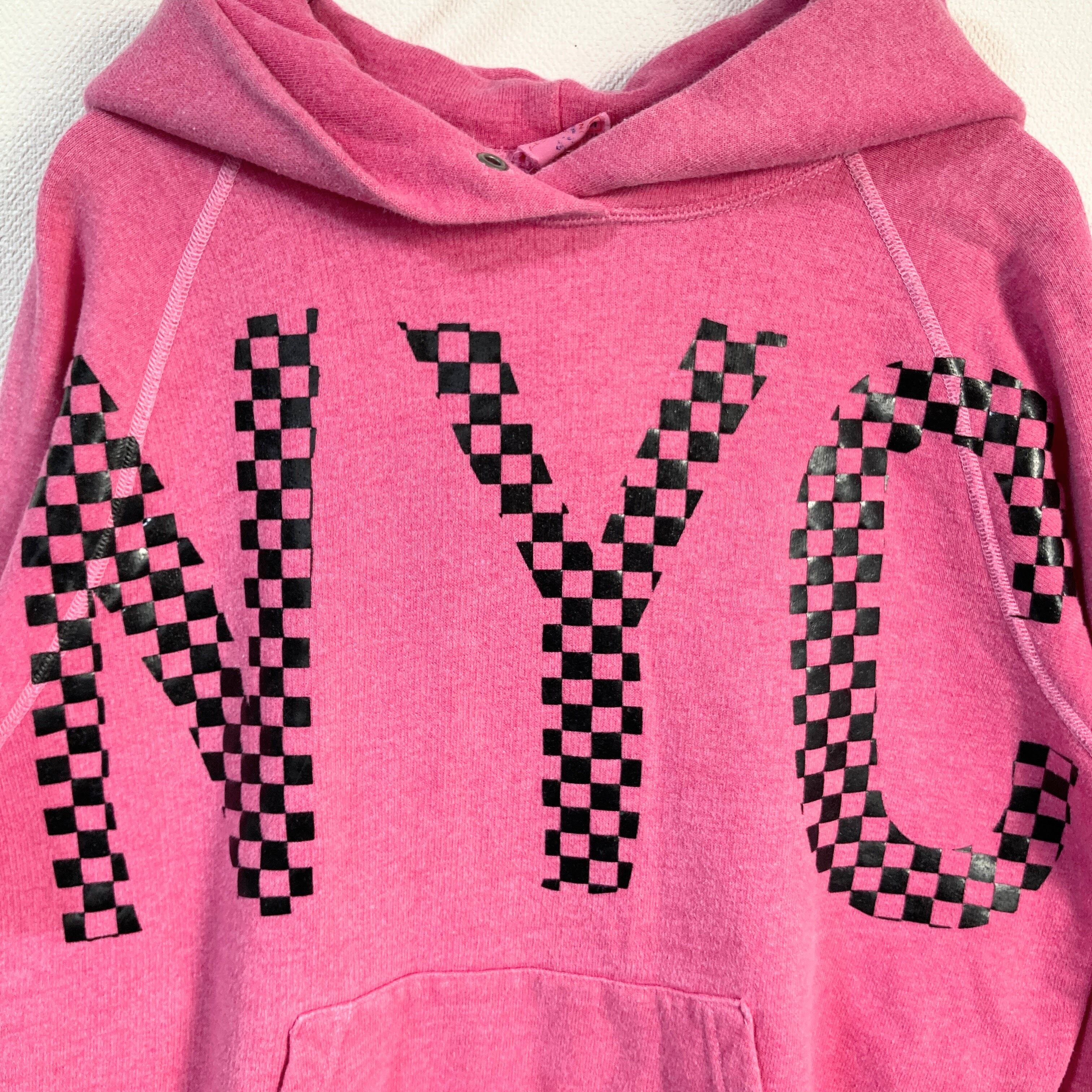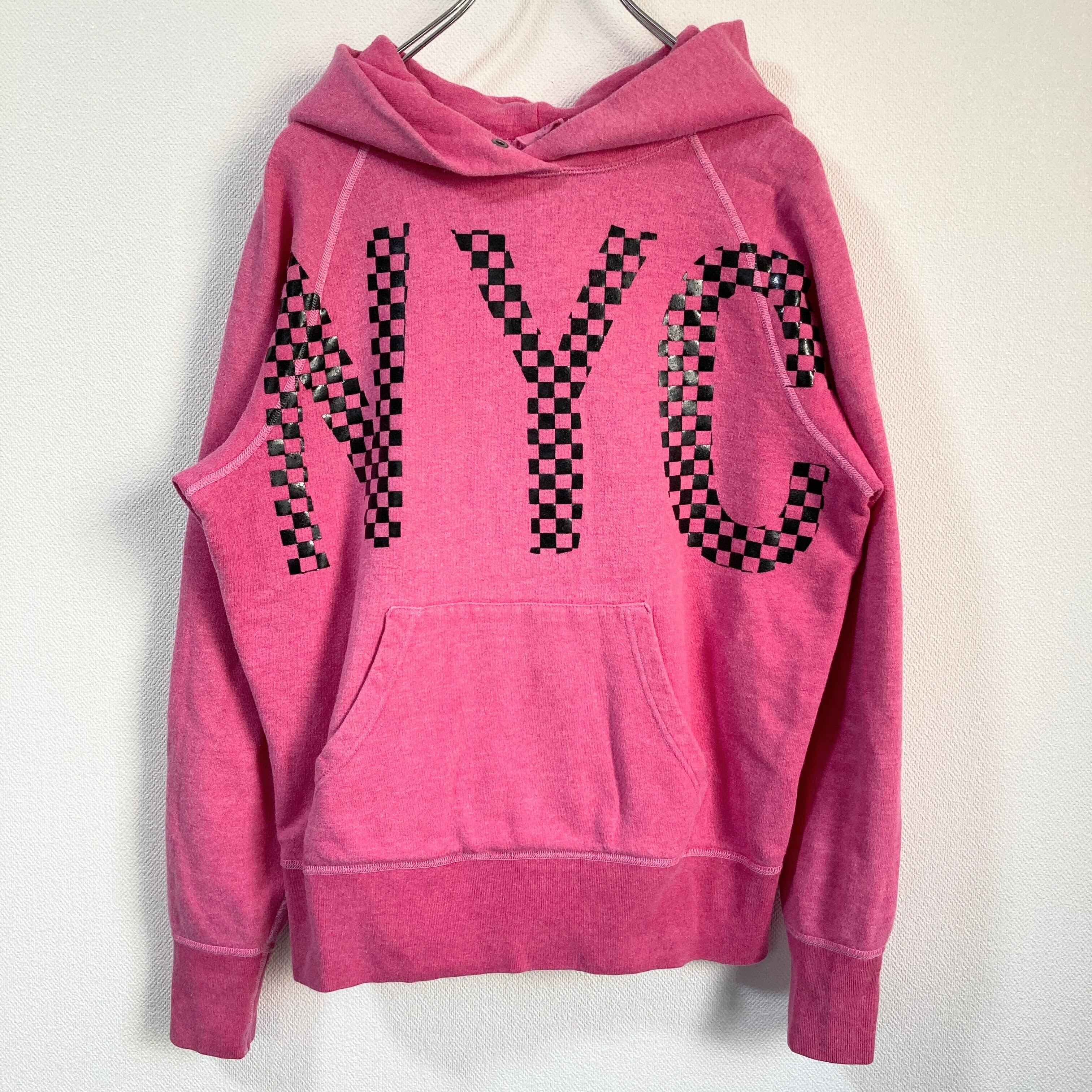 ビビットなピンクの可愛いパーカーで、前面にチェッカー柄のフォントでNYCのBIGロゴが特徴的なパーカーです。