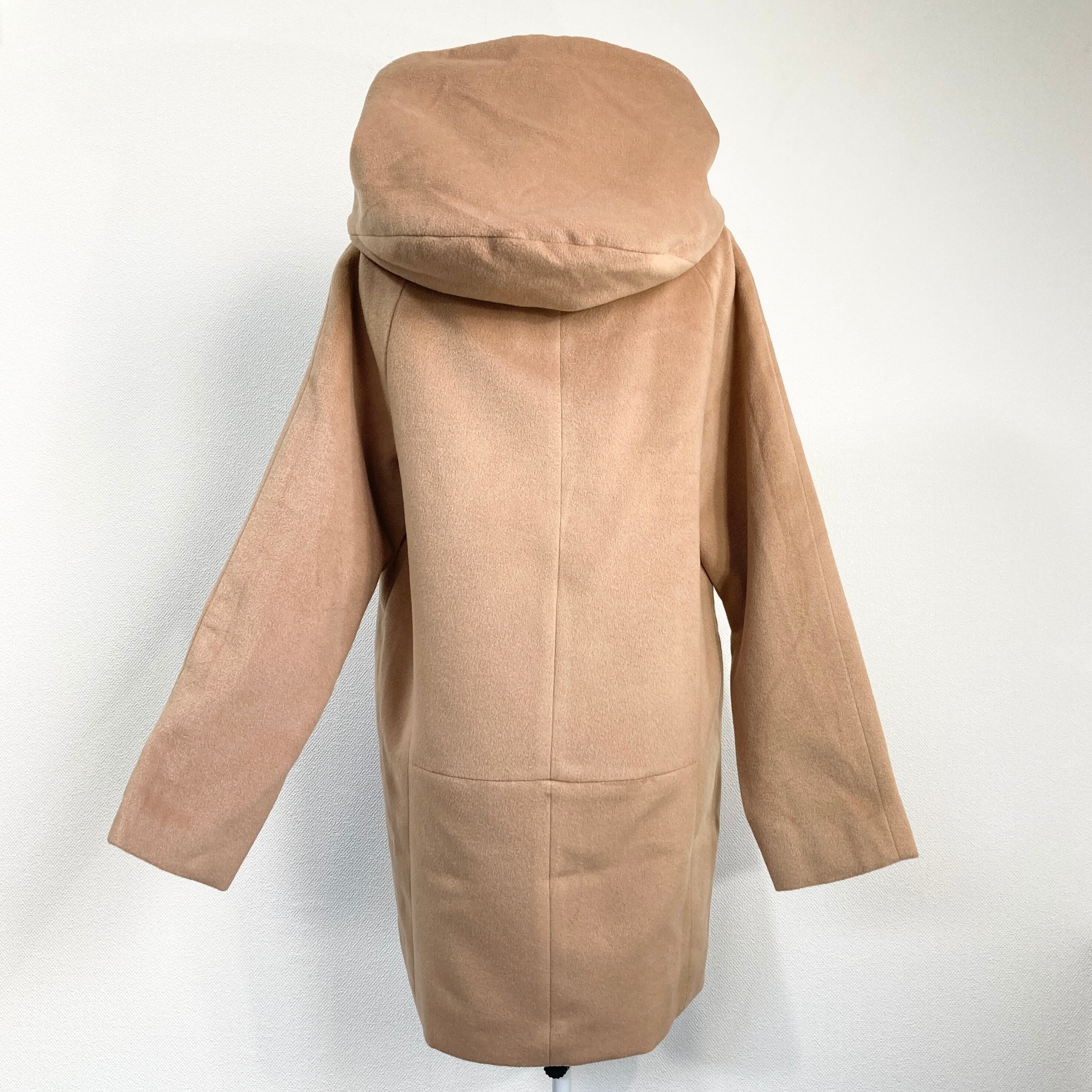 キャメル色で明るく、シンプルなデザインで上品!大きいフードが可愛さと機能性を兼ね備え、大人可愛い印象のロングコートです。
